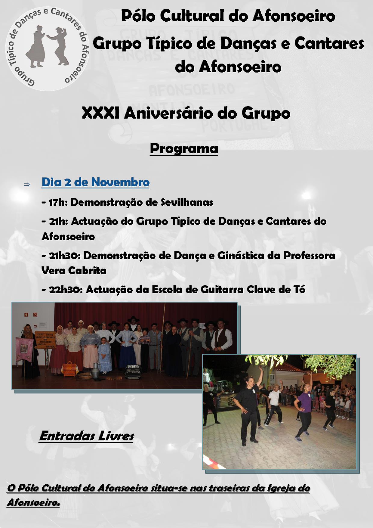 22-10-2013 22:34O Grupo Típico de Danças e Cantares do Afonsoeiro, está a organizar as comemorações do XXXI Aniversário do Grupo que decorrerá no dia 2 de Novembro de 2013, partir das 17h no Pólo Cultural do Afonsoeiro.